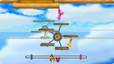 パートナーと一緒に空に浮かぶ回転リフトを操作。クッパJr.とどちらが先にゴールできるか競争です。