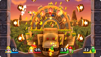 タル大ほうの中から飛び出して、空中のバナナを奪いあい! タル大ほうの向きやタイミングがポイントです。