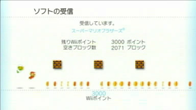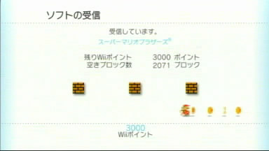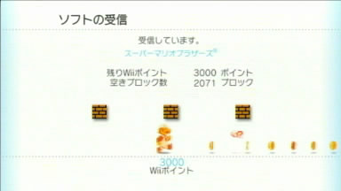 私のWiiメニューは3ページ目まで埋まっちゃいました。クラシックコントローラと5000ポイントのカードのセットを2つ買ったんですけど、10000ポイントあると、ソフトを購入しても購入してもまだ余っているというすごく裕福な感じが味わえます(笑)。 | |