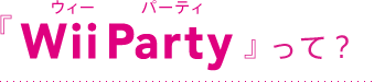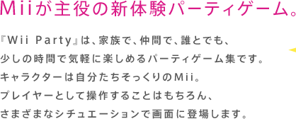 Miiが主役の新体験パーティゲーム。『Wii Party』は、家族で、仲間で、誰とでも、少しの時間で気軽に楽しめるパーティゲーム集です。キャラクターは自分たちそっくりのMii。プレイヤーとして操作することはもちろん、さまざまなシチュエーションで画面に登場します。