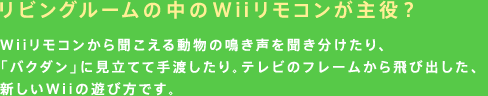リビングルームの中のWiiリモコンが主役?Wiiリモコンから聞こえる動物の鳴き声を聞き分けたり、「バクダン」に見立てて手渡したり。テレビのフレームから飛び出した、新しいWiiの遊び方です。