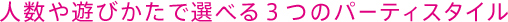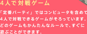 4人で対戦ゲーム 「定番パーティ」ではコンピュータを含めて4人で対戦できるゲームがそろっています。どのゲームもかんたんなルールで、すぐに遊ぶことができます。