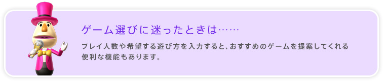 ゲーム選びに迷ったときは…… プレイ人数や希望する遊び方を入力すると、おすすめのゲームを提案してくれる便利な機能もあります。