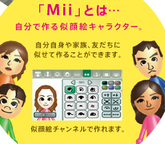 「Mii」とは…自分で作る似顔絵キャラクター。自分自身や家族、友だちに似せて作ることができます。似顔絵チャンネルで作れます。