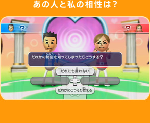 相性チェック お互いに相手にバレないようにして質問に答え、さらにいっしょにミニゲームにチャレンジして、その結果から2人の仲良し度を判定します。ミニゲームは2人の協力がポイントです。