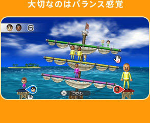 バランスシップ 左右のバランスをとりながら、交互に船のマストにMiiをのせていくゲームです。ミニゲームに挑戦し、その結果によってマストにのせるMiiのサイズが変わります。Miiの大きさと、のせる場所をよく考えて……