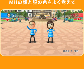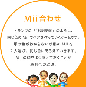 Mii合わせ トランプの「神経衰弱」のように、同じ色のMiiでペアを作っていくゲームです。服の色がわからない状態のMiiを2人選び、同じ色にそろえていきます。Miiの顔をよく覚えておくことが勝利への近道。