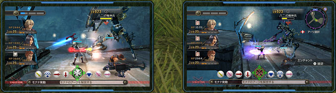 機神兵の強固な装甲には、モナドの力を使った特別な攻撃方法を用いないとダメージを与えられません。モナドを装備したキャラクターがその力を解放して、仲間に能力を貸し与えることで、メンバーの攻撃も機神兵に通用するようになります。