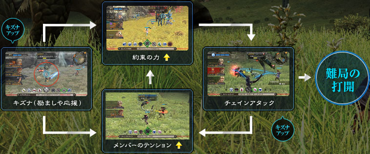バトルのサイクル 仲間のキズナを起点として、パーティーの結束を強め、強力な連携攻撃につなげることができます。