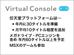 年内に、任天堂プラットフォームで30タイトルをお楽しみいただけるように準備を進めています。その後、月平均10タイトル程度を目安に、順次追加をしていく予定です。これに、セガさんのメガドライブ、ハドソンさんのPCエンジンのラインナップを加えると、年内に60タイトル以上が揃う見込みです。 また、MSXのゲームもラインナップに加わることになりました。今後も、このような新たなプラットフォームの参入のご要望があれば、積極的に検討していきたいと思っています。 また、バーチャルコンソールは、単に懐かしのクラシックゲームを販売するだけでなく、それ以外にもさまざまな可能性を持っています。サイズに制限はありますが、Wii専用のコンパクトなソフトをダウンロード販売する準備も進めています。