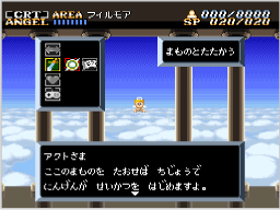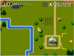 ゲームは神の居城である「天空城」から始まります。ここからアクションモード(ACT 1)に移り、魔物を倒して土地を浄化してください。浄化した土地は発展させることができ(CRT)、特定の条件を満たすと次のアクションモード(ACT 2)が始まります。ACT 2をクリアするとその土地から魔物がいなくなるので、天空城に戻ってほかの土地に移動しましょう。 |