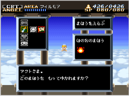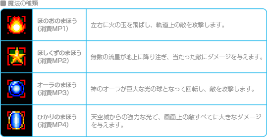 魔法はゲームを進めると手に入り、アクションモードで使うと、MPを消費してさまざまな効果を発揮します。「まものとたたかう」を選ぶ前に、「まほうをえらぶ」で装備する魔法を選んでおきましょう。 ※ゲーム開始時は魔法を持っていません。 |