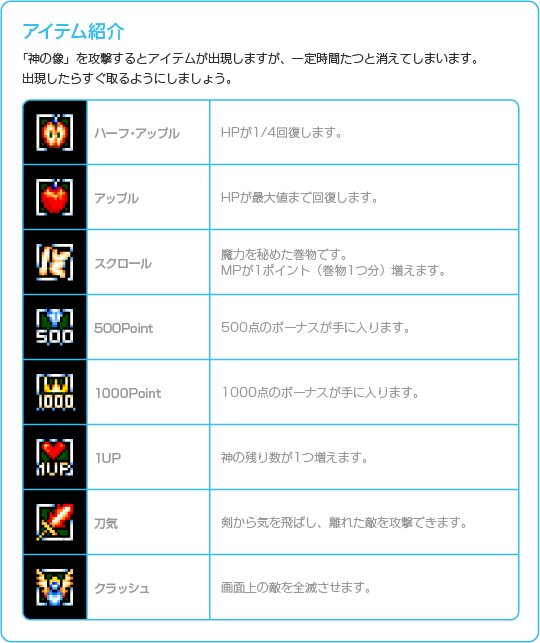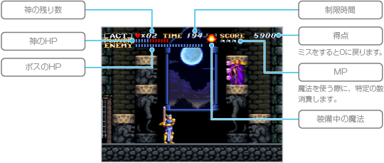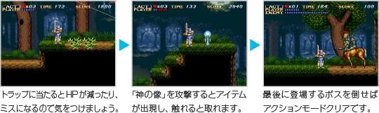 石像に乗り移った神を操作し、魔物を倒したり、トラップをよけながら進んでください。ボスを倒すとクリアとなり、ACT 1の場合はクリエイションモードに移ります。ACT 2をクリアした場合は天空城でほかの土地に移ってください。 ![]() |