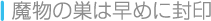 魔物の巣は、多くの魔物を生み出します。この魔物は人間が姿を変えられたもので、倒した魔物は魂となり、次の「まち けんせつちゅう」のときに人間として生まれ変わります。また、封印された巣の中にいた魔物も同様に人間になり、逆に死んでしまった人の魂は、魔物に生まれ変わります。魔物は多くの害をもたらし、発展を邪魔するので、人口を増やして早めに魔物の巣を封印するとよいでしょう。 |