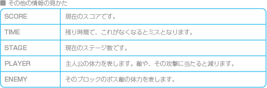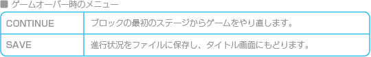 「主人公の体力がなくなる」「残り時間がなくなる」「床の穴に落ちる」とミスとなり、ステージの最初からやり直しとなります。残り数が0のときにミスするとゲームオーバーです。右の画面が表示されるので、 |