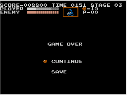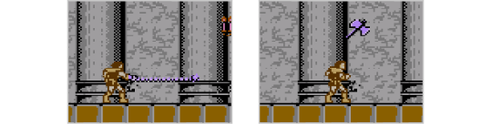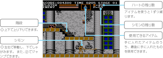 主人公シモンを操作して、敵と戦いながらドラキュラ城を進みます。 最上階にいる魔王ドラキュラ伯爵を倒すとゲームクリアです。 |