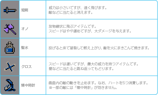 手に入れるとシモンがパワーアップするアイテムです。積極的に集めましょう。