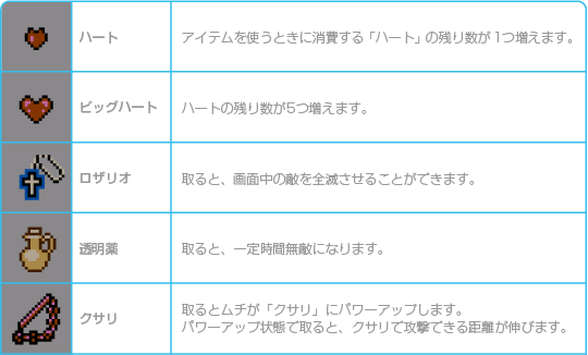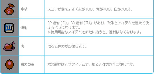 敵を倒したり、ステージ中の物(炎の台座やローソク、一部の壁など)を壊すと、さまざまなアイテムを落とすことがあります。