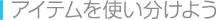 威力は低いですが扱いやすい短剣、下の敵をねらうのに向いた聖水など、アイテムにはそれぞれ特徴があります。新しいアイテムを見つけたときは、現在使用中のアイテムと比べ、どちらがより効果的かということを考えてから取るといいでしょう。 ![]() |