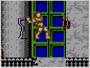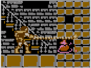 アイテム「肉」や「連射」はステージ中の特定の場所に隠され、そこをムチで攻撃すると出現します。うまく見つけてゲームを有利に進めましょう。なお、「連射」は同じアイテムを使って敵を倒し続けた(または物を壊した)ときも出現するようです。 |