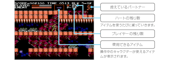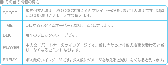 主人公のラルフやパートナーを操作して、敵を倒しながらステージを進んでいきましょう。 ゲームの舞台は基本的に3ステージを1ブロックとして構成されています。ブロックの最後に登場するボス敵を倒して「命の玉」を手に入れると、ブロッククリアとなります。 ※ゲーム中に