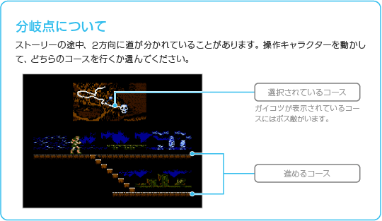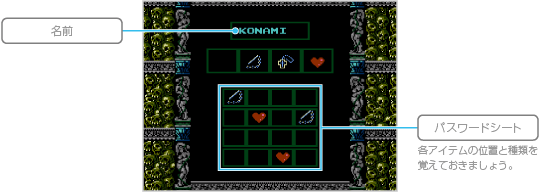 ゲームオーバー画面で「CONTINUE」を選ぶと、ゲームオーバーになったブロックの最初からスタートできます。 また、「PASSWORD」を選ぶとパスワードシートが表示されます。次回ゲームを始めるときに、「名前」と「パスワードシート」に表示されたパスワードを正しく入力すると、ゲームオーバーになったブロックの最初から再開できます。ゲームを終えるときは、忘れずにメモしておきましょう。 ![]() |