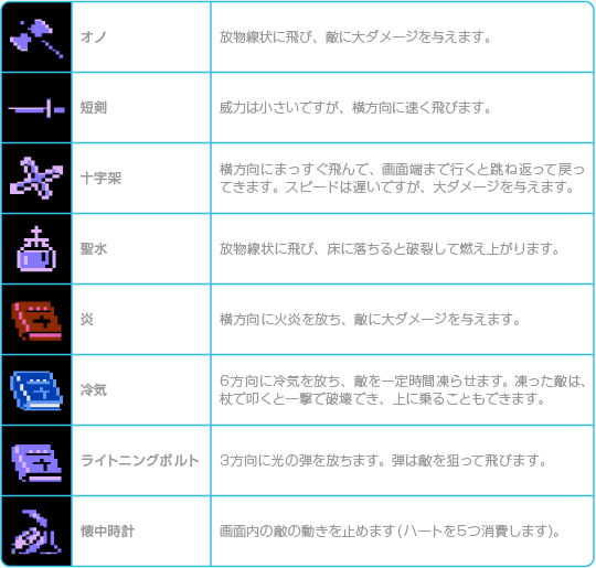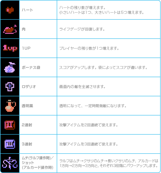 アイテムは、取ると自動的に効果のある「通常アイテム」や、取ると画面内に表示され、ハートを消費して使う「攻撃アイテム」があります。