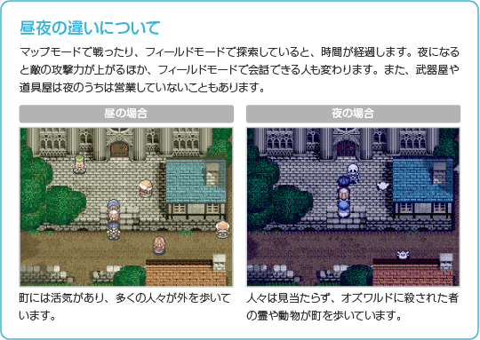 主人公はオズワルドを倒すために、仲間とともにさまざまな敵と戦ったり、町で情報を集めたりして、物語を進めていきます。 このゲームでは、最大4人の仲間とともに、パーティーを組んで行動します。 |