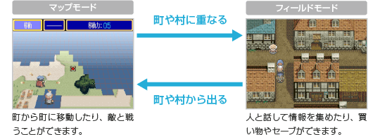 このゲームは、おもにマップモードとフィールドモードの2つの画面で物語を進めます。マップモードは世界の全体マップで、フィールドモードは町や村の中の画面です。 ![]() |