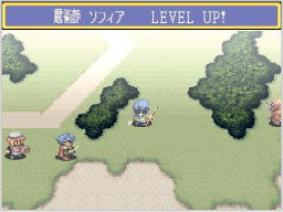 マップモードでは敵が登場し、攻撃すると(されると)戦闘になります。敵の耐久力を0にすると倒すことができ、倒すとEXPやお金($)などが手に入ります。EXPが一定値に達するとレベルアップし、ステータスが上昇して、耐久力が全回復します。 |