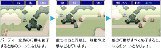 このゲームは、マップモードで味方パーティーのターン(行動順)と敵パーティーのターンを繰り返して進めます。味方パーティー全員の行動が終わると、敵のターンになります。敵も同様に行動を終えると、ふたたび味方のターンになります。 ![]() |