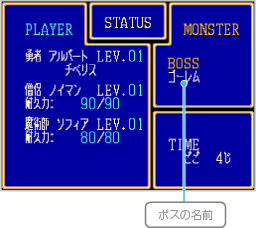 物語を進めるには、ボスを倒してイベントを進める必要があります。ボスは、フィールドモードからマップモードに移ったときや、ターン終了時に表示される画面で確認できます。 |