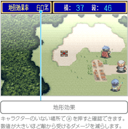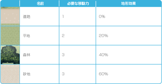 地形は以下のようなものがあり、それぞれ移動に必要な移動力や、ダメージを減少させる地形効果が異なります。