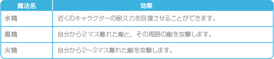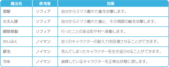 ソフィアとノイマンが使えるコマンドです。魔法によって効果が異なります。 ![]() |