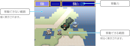 キャラクターを移動させます。移動力が残っていれば、ほかの行動をしたあとも移動できます。移動力は、ターンが終わると回復します。 ![]() |