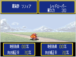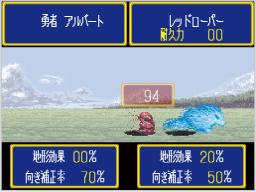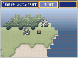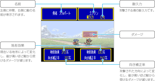 隣接した敵を装備中の武器で攻撃するコマンドです。キャラクターや武器によって、一度に攻撃する回数が異なります。攻撃時は以下の戦闘画面が表示され、攻撃が終わるとマップモードに戻ります。 ![]() |
