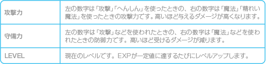 各キャラクターの耐久力や攻撃力といったステータスは、各モードで確認できます。