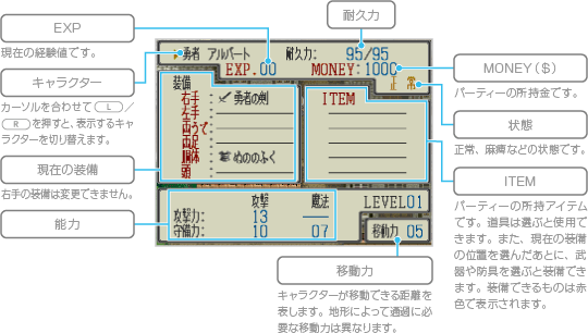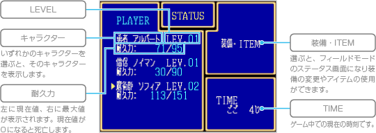 を押すと、以下の画面が表示されます。いずれかのキャラクターか「装備・ITEM」を選んでください。