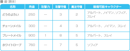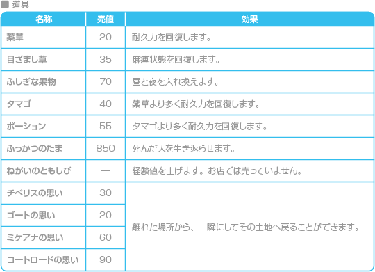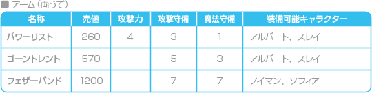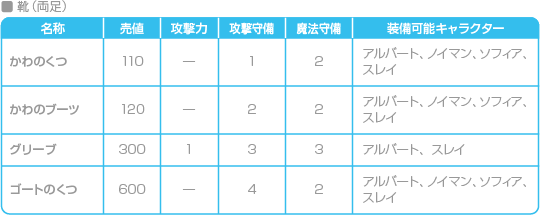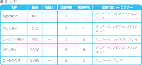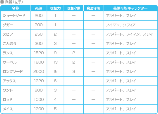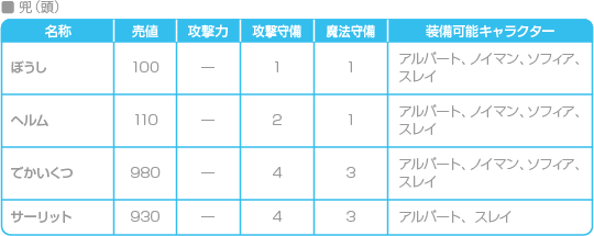 武器や防具、道具の一例です。カッコ内は装備できる位置を示しています。