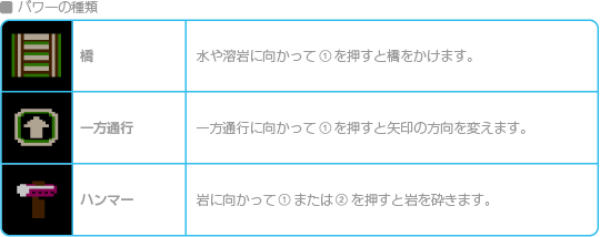 ロロが使えるパワーには3種類あり、パワーマークのあるラウンドで使うことができます。光っているハートフレーマーを取ってパワーを使えるようにしましょう。ハートフレーマーはいくつかのハートフレーマーを取ると光り出し、光り出すまでに必要な数はラウンドによって異なります。