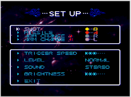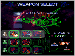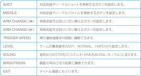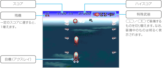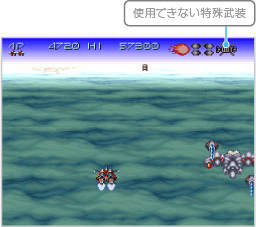 「敵や障害物にぶつかる」または「使用できない特殊武装を装備しているときに敵の弾に当たる」と、ミスとなります。ミスになると残機が1減り、特殊武装がすべて復活してその場から再開します。 |