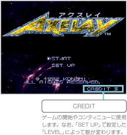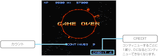 残機が0のときにミスをするとゲームオーバーとなり、右の画面が表示されます。カウントが0になる前に ![]() |