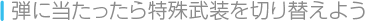 | 敵の弾に当たると、装備中の特殊武装が使用できなくなります。この状態で敵の弾に当たるとミスになってしまうので、使用可能な特殊武装にすぐ切り替えましょう。 | ![]() |