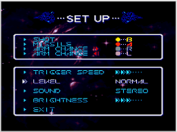 | 「SET UP」で設定できる「LEVEL」によって、ゲームの難しさやCREDITの数が変わります。慣れないうちは「EASY」でプレイし、特殊武装の特徴や敵の出現パターンを覚えましょう。また、難しい「LEVEL」ほどエンディングの内容が充実するので、慣れてきたら「NORMAL」「HARD」にも挑戦してみましょう。 | ![]() |