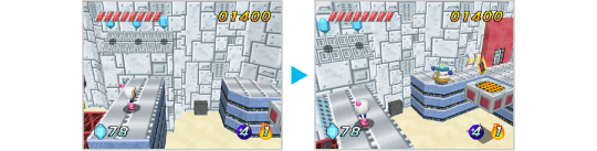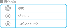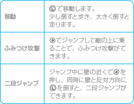 フロアや崖などから落ちそうになったり、ジャンプ後にフチに手が届くときは、フチにぶら下がることがあります。ぶら下がっているときは、フロアや崖などの方向に |
