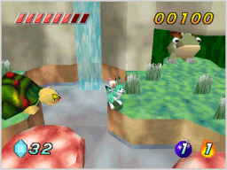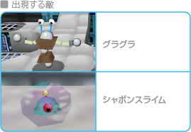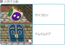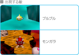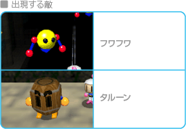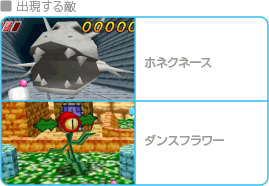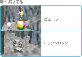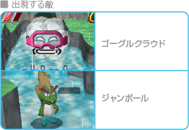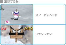 雪ダルマや雪男のような敵がたくさん登場します。転がるたびに大きくなる雪玉に注意しましょう。また、雪山を下りるときにはスライダーでうまく進みましょう。 |