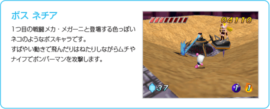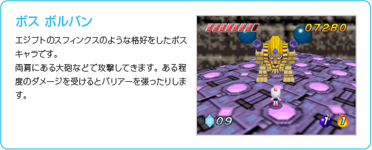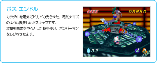 電流攻撃がパワーアップ。画面全体に放電してくるのでジャンプでかわせ!止まったら攻撃をしてくるので必ず避けよう。あとは爆弾をぶつけるだけで倒せるぞ! |