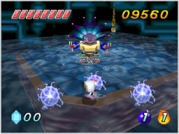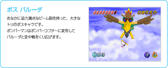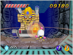 ついに復活してしまったバグラーはタックル・ワープ・衝撃弾などを駆使して攻撃してきます。しかしここまで勝ち残ってきたボンバーマンなら必ず勝てるはず。今までに覚えたテクニックでバグラーを再び倒しましょう。 |