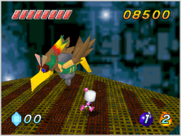 今度は空対地上の戦いなので、高いところにいるうちは攻撃が届かない。急降下で襲ってきたあとがチャンス。ジャンプして爆弾をぶつけよう! |