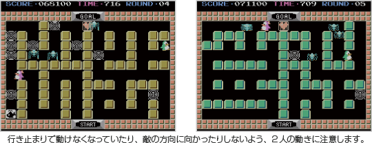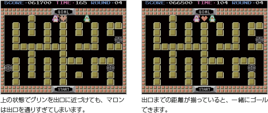 グリンが左に動くとマロンは右に動く、グリンが右に動くとマロンは左に動くといったように、2人は同時に左右逆に動きます。さらに、迷路には動き回る敵がいて、迷路の左右のブロックは配置が異なります。2人とも出口に向かわせるには、「通路を歩いて進んでいる」「周囲に敵がいる」など、2人の状況に注意することが大切です。 ![]() |